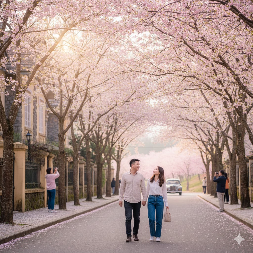 Càng tiến gần về phía giữa tháng 1 đến giữa tháng 2, sức sống của mùa xuân sẽ lan tỏa mạnh mẽ vào trung tâm thành phố. Đây là thời điểm mai anh đào đạt độ mãn khai rực rỡ nhất, trùng khớp với kỳ nghỉ Tết Bính Ngọ 2026, biến Đà Lạt thành một thiên đường màu hồng thực thụ. Mai anh đào Đà Lạt mang một vẻ đẹp rất riêng biệt với hình dáng năm cánh nhỏ nhắn, sắc hoa hồng trắng tinh khôi không quá sặc sỡ nhưng lại vô cùng cuốn hút. Loài hoa này không chỉ là một hiện tượng thiên nhiên mà đã trở thành biểu tượng mùa xuân của phố núi, tượng trưng cho sự khởi đầu mới đầy nhựa sống và nét lãng mạn đặc thù của vùng đất cao nguyên Lâm Viên.