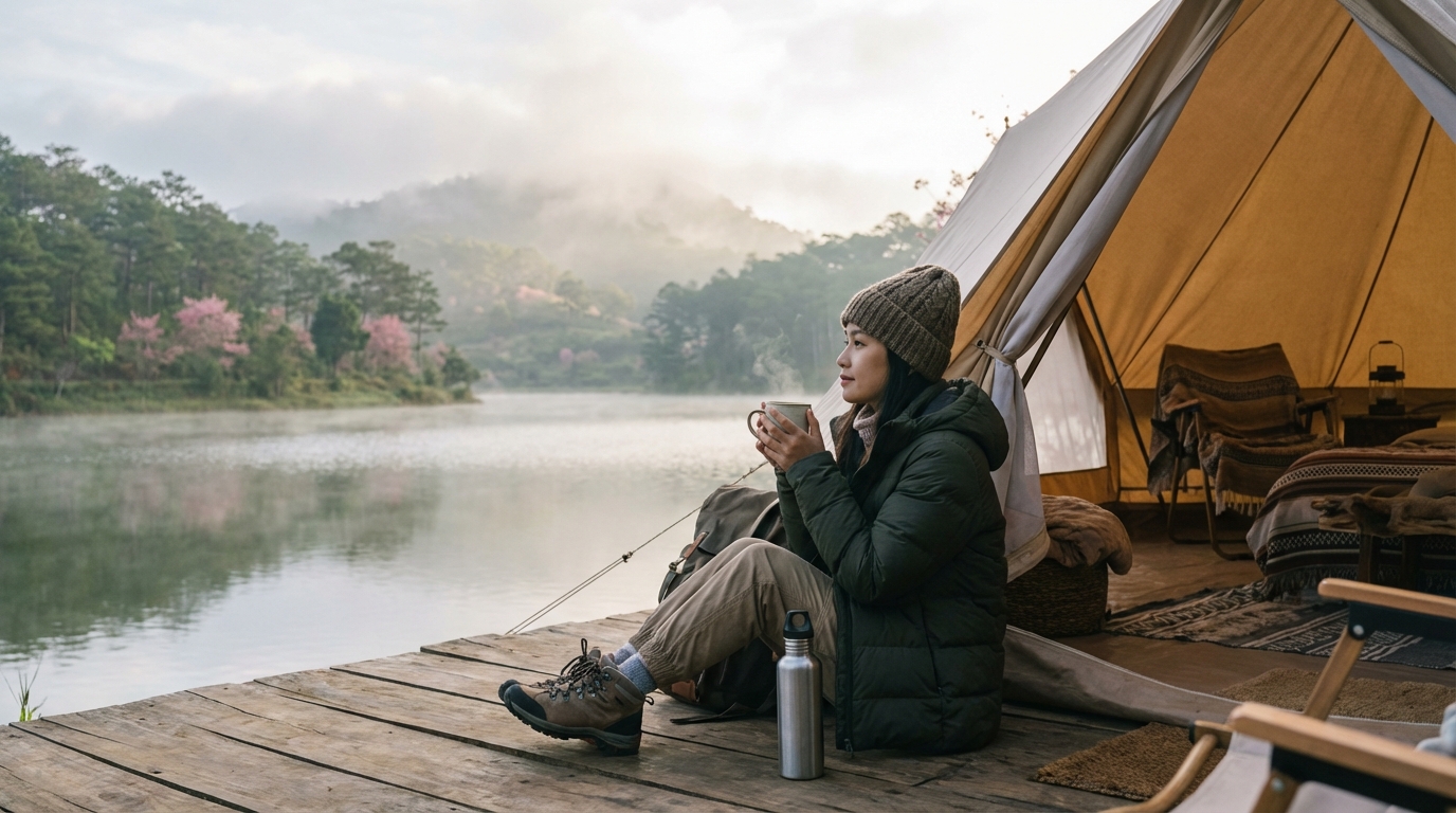 Để hành trình tìm về với bản ngã giữa đại ngàn Tuyền Lâm được trọn vẹn, việc trang bị những kiến thức thực tế là điều không thể thiếu cho bất kỳ du khách nào. Đầu tiên và quan trọng nhất chính là việc chọn lựa thời điểm lý tưởng để bắt đầu chuyến phiêu lưu. Theo kinh nghiệm của những người sành du lịch, thời gian đẹp nhất để trải nghiệm glamping bên hồ chính là từ tháng 11 đến tháng 6 năm sau. Đây là lúc Đà Lạt bước vào mùa khô, tiết trời se lạnh đặc trưng nhưng luôn tràn ngập nắng vàng hanh hao, giúp mặt hồ trở nên xanh trong và lấp lánh hơn bao giờ hết. Quan trọng hơn, việc tránh được mùa mưa dầm dề kéo dài từ tháng 7 đến tháng 10 sẽ đảm bảo các hoạt động ngoài trời không bị gián đoạn, đồng thời giữ cho khu vực cắm trại luôn khô ráo, tránh tình trạng ẩm mốc hay các con đường mòn trơn trượt giữa rừng thông già. Vào những tháng đầu năm, bạn còn có cơ hội chiêm ngưỡng sắc hồng của hoa mai anh đào nở muộn len lỏi giữa sắc xanh của rừng núi, tạo nên một khung cảnh vô cùng lãng mạn.