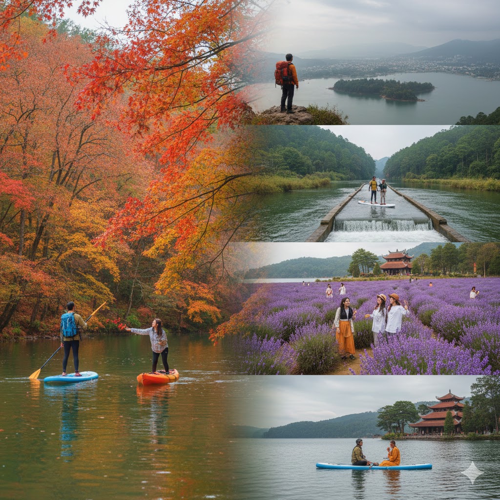 Đến với Hồ Tuyền Lâm trong năm 2026, bạn sẽ thấy nơi đây không chỉ đơn thuần là một hồ nước tĩnh lặng mà đã thực sự trở thành một thiên đường giải trí vận động đầy màu sắc. Hoạt động đáng trải nghiệm nhất chính là chèo SUP (Stand-up Paddleboard) hoặc Kayaking len lỏi qua những ngóc ngách của hồ. Đặc biệt, vào những tháng cuối năm, hành trình chèo thuyền xuyên qua cánh rừng lá phong là một trải nghiệm mang tính biểu tượng. Cảm giác được lướt nhẹ trên mặt nước xanh ngắt, tận mắt ngắm nhìn những tán lá phong chuyển từ xanh sang vàng rồi đỏ rực phản chiếu xuống mặt gương nước thật sự là một khung cảnh khó quên. Bạn có thể ghé vào khu vực rừng sâu để nhặt những chiếc lá phong rơi, tận hưởng bầu không khí trong lành và yên tĩnh tuyệt đối mà hiếm nơi nào có được.