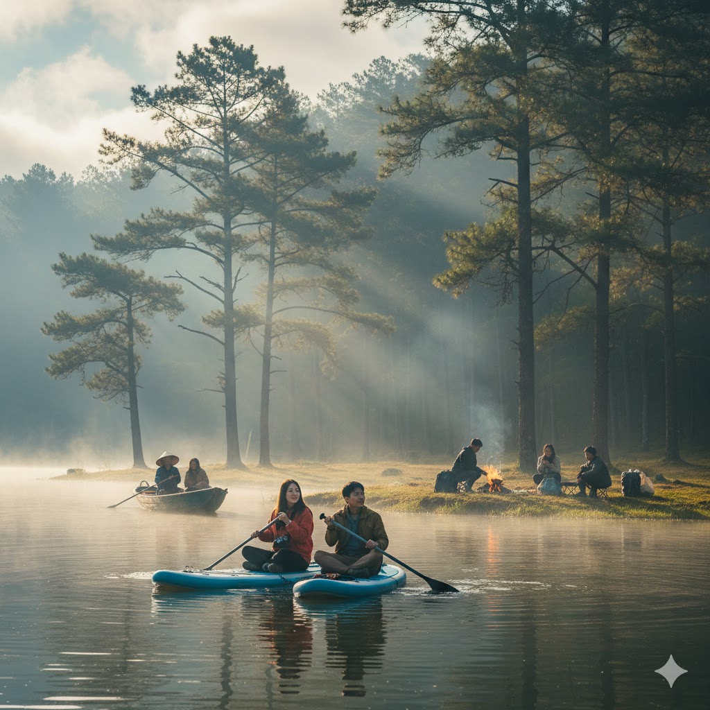 Để thực sự chạm tay vào linh hồn của Suối Tía, bạn phải sẵn sàng thức giấc khi thành phố vẫn còn chìm trong giấc nồng. Khoảnh khắc đắt giá nhất tại đây diễn ra trong khoảng từ 5h30 đến 6h30 sáng, một quãng thời gian ngắn ngủi nhưng đủ để làm say lòng bất cứ ai. Khi những tia nắng đầu tiên của ngày mới bắt đầu xuyên qua tán lá thông, chúng len lỏi và nhảy múa trên làn hơi nước bốc lên từ mặt hồ ấm hơn không khí bên trên. Hiệu ứng Tyndall tạo nên những luồng sáng rực rỡ, chiếu rọi vào màn sương mờ ảo, biến không gian thành một sân khấu ánh sáng kỳ diệu nơi thực và mơ giao thoa. Đây chính là thời điểm vàng để các nhiếp ảnh gia và những tâm hồn yêu thiên nhiên săn tìm những khung hình độc bản, nơi những thân cây chò cổ thụ hiện lên như những bóng ma hiền hòa giữa làn khói sóng.