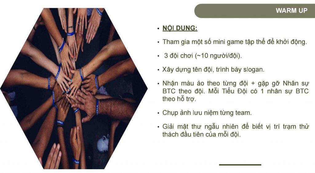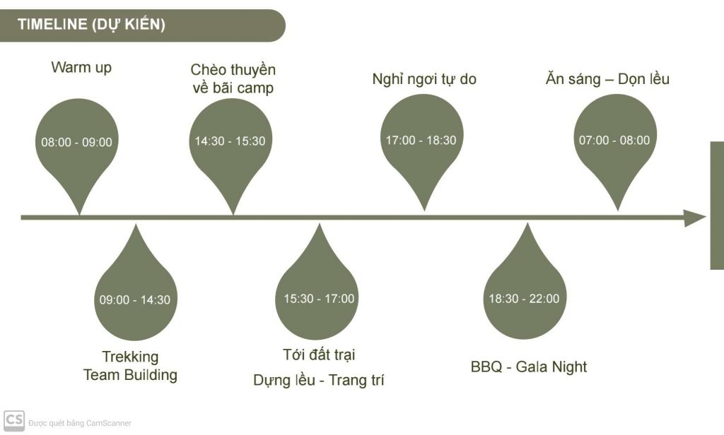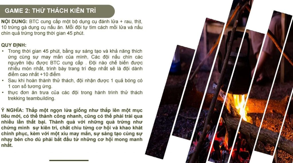 - 16:30: Cả đoàn cùng nhau tập trung cùng nhau chuẩn bị bữa tối với các hoạt động: Lượm củi, nhóm bếp , xiên thịt , nhặt rau ….